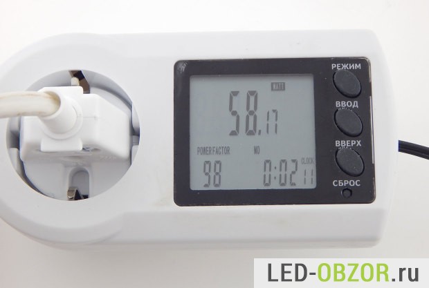 Энергопотребление соответствует заявленному показателю. Коэффициент мощности получился практически максимально возможный 0,98.