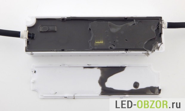 Источник питания находится внутри корпуса светодиодного светильника уличного освещения, в канале для установки на консоль. Для защиты от воздействий влаги внутри он полностью залит герметиком. Отверстие, через которое кабель подключается к пластине, тоже герметизирован.