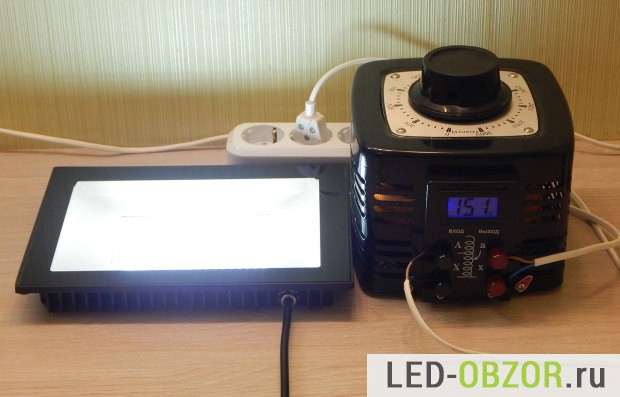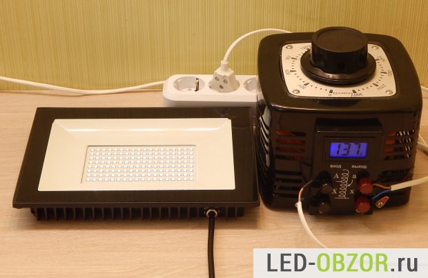 Для понижения напряжения в сети 220 вольт используем автотрансформатор. В отличие от диммера он сохраняет форму синусоиды, не обрезая её. Минимальное рабочее напряжение получилось примерно 140 вольт, когда они начинают немного светить.