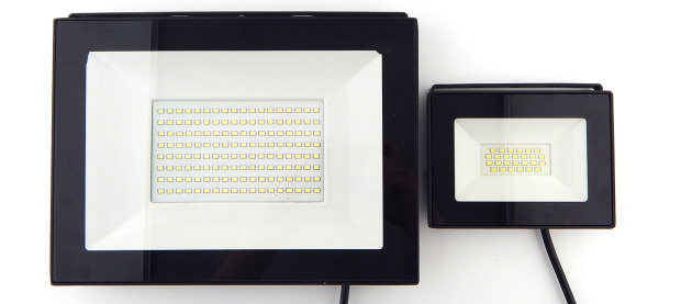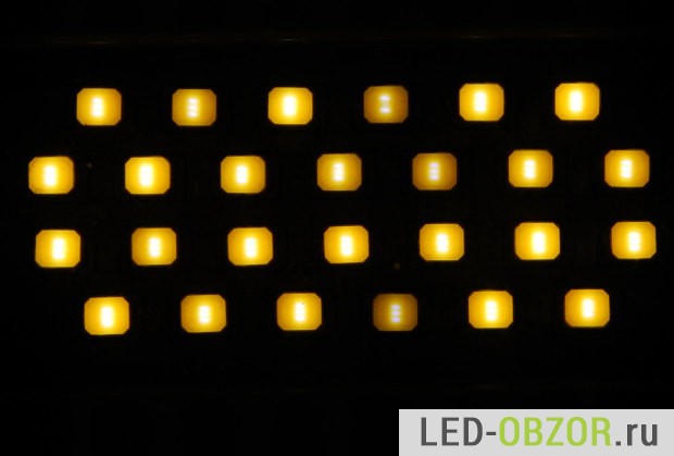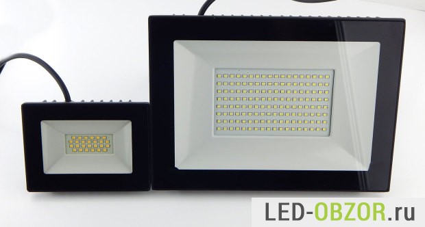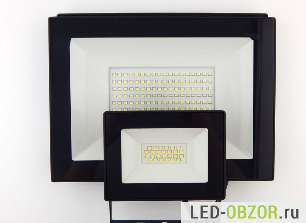У светодиодного прожектора на 10 ватт среди установленных светодиодов, выделяются 3 штуки. У модели на 50 ватт свечение кристаллов более равномерное. Чем ниже разброс параметров светодиодов, там выше у них качество.