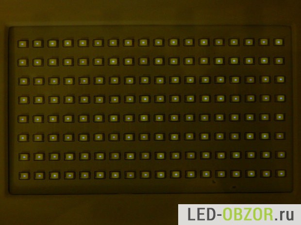 В бюджетном ценовом сегменте желательно проверять разброс электрических параметров светодиодов. На глаз это можно проверить, включив LED на очень малом токе, чтобы слегка светились. Многие ошибочно думают, что источником является желтая часть диода. На самом деле это только люминофор, которым покрыт кристалл. На фото видно размеры кристаллов и их количество