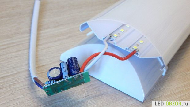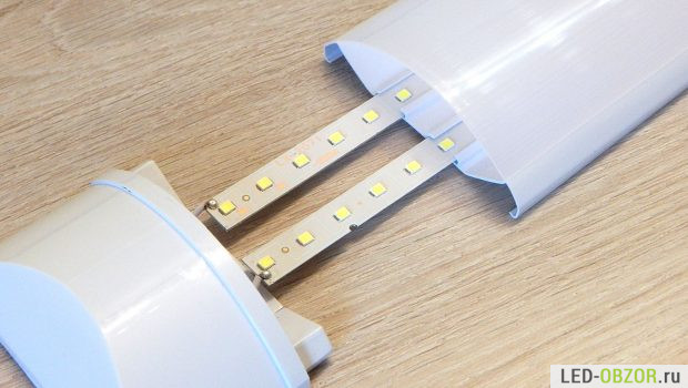 Внутри находится две светодиодные линейки шириной 10мм, соединены последовательно. На концах расположены декоративный заглушки, а одной из них находится блок питания (драйвер).