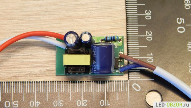 Блок питания очень компактных размеров и размещается в торцевой заглушке. Малые размеры реализованы за счёт последовательного включения всех светодиодов и линеек. Из-за этого напряжение на светодиодных линейках высокое, при этом сила тока получается низкой.
