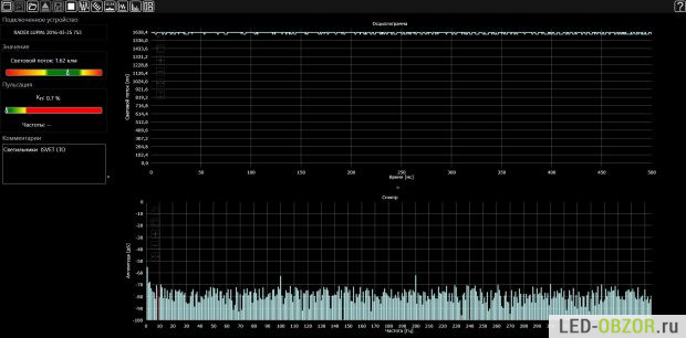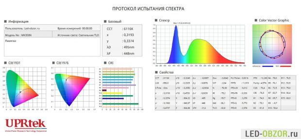 Замеры проводятся спектрометром UPRtek MK350. Комплектующие использованы одинаковые, поэтому результаты у 3 образцов одинаковые. Показатель цветовой температуры равен 6116К, при обещанном 6000К.
