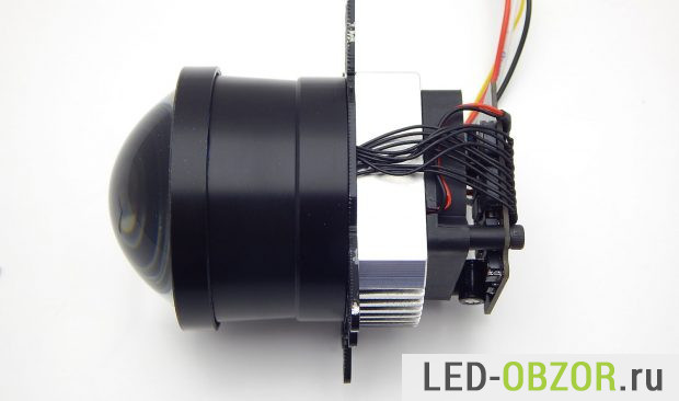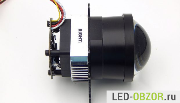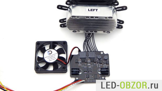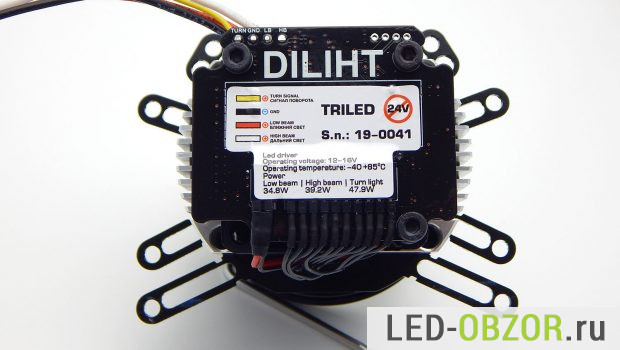 Плата управления находится в задней части светодиодного модуля. Контуры импульсных преобразователей питания светодиодов оснащены экранированными индуктивностями. Для защиты от случайных механических воздействий и конденсата драйвер покрыт лаком. Внутри фары этого вполне достаточно.