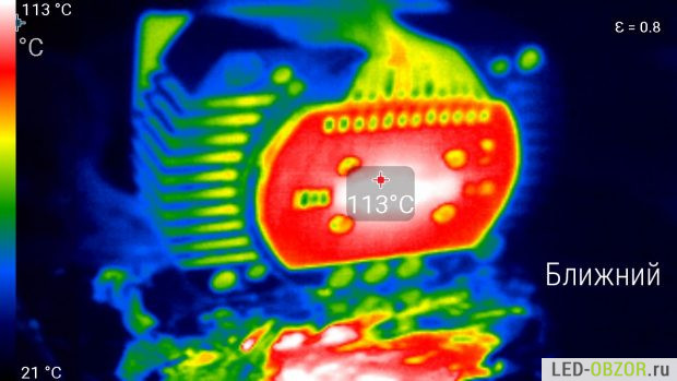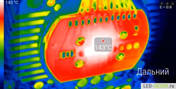 После прогрева в течение 1 часа замеряем тепловизором нагрев. Современные светодиоды выдерживают нагрев до 150 градусов, сохраняя при этом заявленные характеристики. Максимальное энергопотребление светодиодной линзы получилось 52 Ватта, при включении секции подсветки поворота.