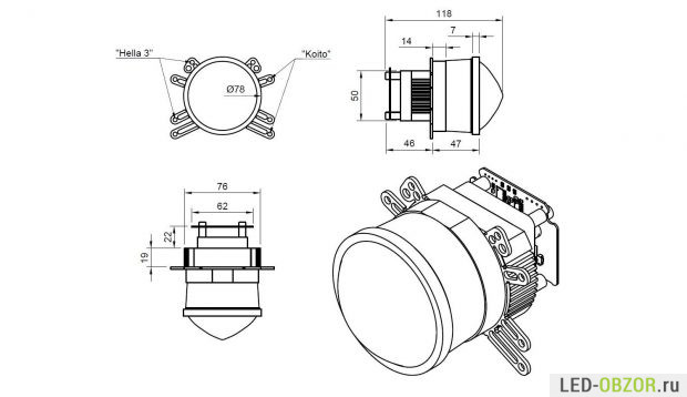 Для установки в фары с отражателем переходников под гайку нет, так как они закрывают доступ для обслуживания. Модуль необходимо устанавливать на шпильки. Для облегчения этого варианта установки производитель предусмотрел регулировку горизонта, что очень удобно. На Bi Led модуль устанавливаются все бленды «3» дюйма. Все точки подключения находятся внутри фары.