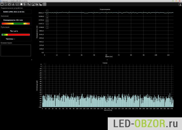 Проведем замеры коэффициента пульсаций прибором Radex Lupin. Этот параметр покажет силу мерцания света и косвенно характеризует качество источника тока. Если сэкономили или недоработали, это будет видно. Замеры показали пульсации 1,5%, то есть они полностью отсутствуют. Спектрограмма по частотам абсолютно ровная, пиков нет.