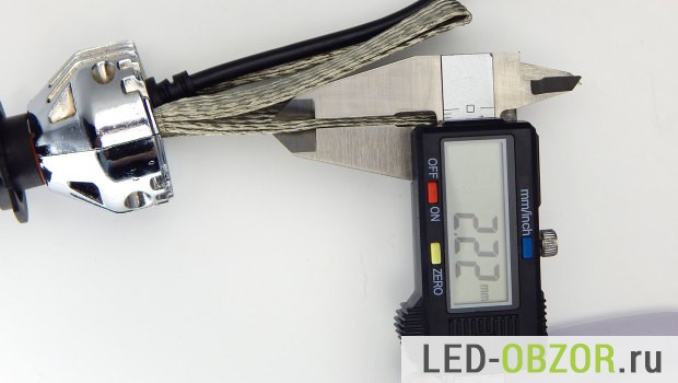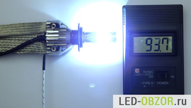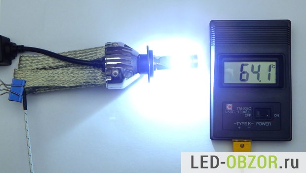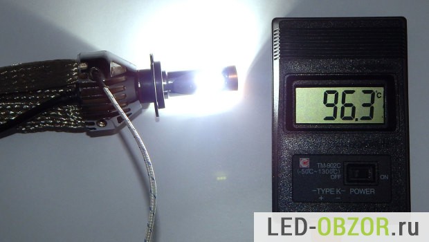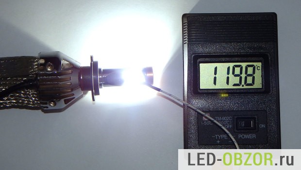 Для измерения температуры будем использовать пирометр и термопару. Габариты термопары хорошо подходят для измерения нагрева светодиодов Филипс. Для максимальной точности, датчик прогревался в течение 30 минут на каждой точке. Сама автолампочка led H7 грелась в течение 60 минут.