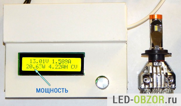 Измерение мощности проведем при напряжении 13 Вольт. Например, Osram тестируют диодные автолампы при 13,2V. Измеренное энергопотребление меньше составило 20,6W. Оно немного зависит от напряжения питания, так как меняется КПД драйвера. Пульсации полностью отсутствуют, значит он хорошо справляется с нагрузкой.