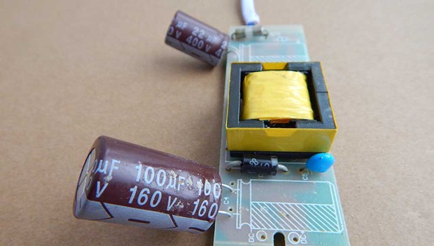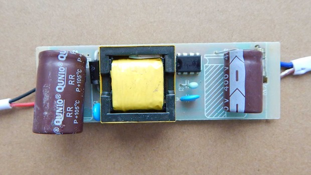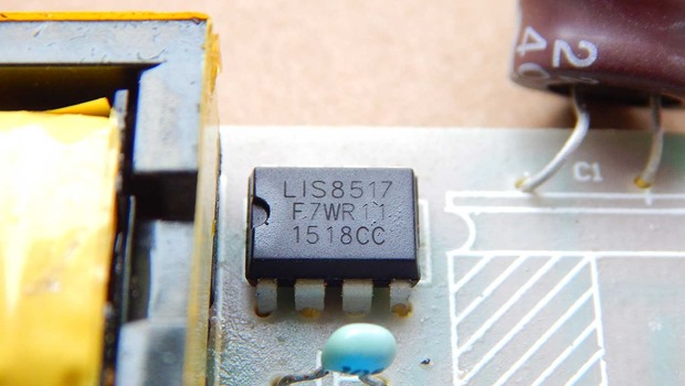 Схема основана на китайской микросхеме LIS8517, внятный даташит на неё найти не удалось. На выходе источника тока установлен конденсатору на 100мкФ вместо положенных 50мкФ. Используется улучшенная типовая схема, которая обеспечит более высокую стабилизацию тока.