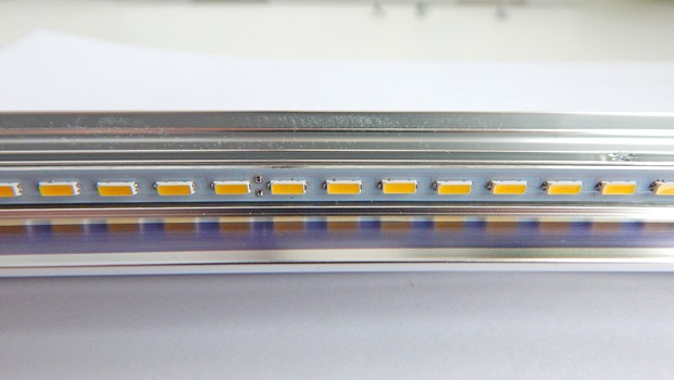 В нашем случае на каждой стороне находится алюминиевая линейка толщиной 1мм. на 90 штук SMD 4014. Мощность каждого 0,2W, вся диодная линейка 18Вт. Но она находится на алюминиевом профиле с несколькими внутренними ребрами, что повышает площадь теплообмена. На открытом воздухе диоды прогрелись до 70°.