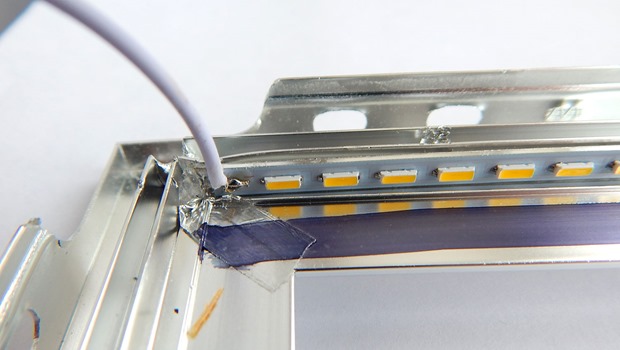 Лицевая поверхность светится равномерно, даже невозможно определить, где находятся диоды, они только с двух сторон квадрата из четырёх. Весь принцип основан на распространении света внутри оргстекла, с внутренней стороны которого находится белый отражатель.