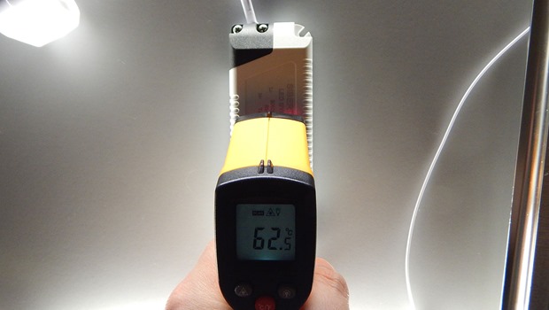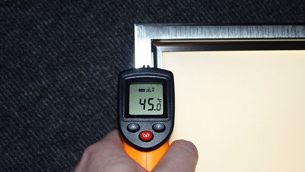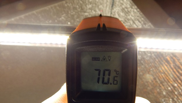 Температуру нагрева панели проверена в собранном и при полностью разобранном корпусе. Сперва были проведены замеры нагрева светодиодов на открытом воздухе, получилось 70,5°. Как и предполагал, нагрев получается в пределах нормы, но греется прилично. Если бы LED элементы были расположены с 4 сторон, то температура была гораздо ниже.