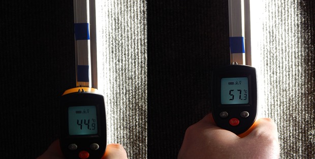Чтобы получить достоверные данные по температуре алюминия, пришлось клеить кусочки высококачественной импортной синей нано-изоленты, сделанной в Германии. Коэффициент эмиссии алюминьки низкий, инфракрасный пирометр показывает меньше, чем чувствуется на ощупь. Изолента прогревается и замер получается точным.