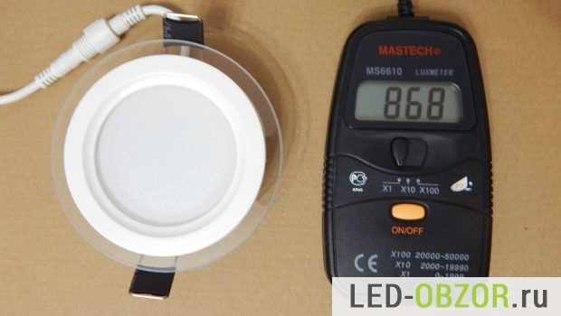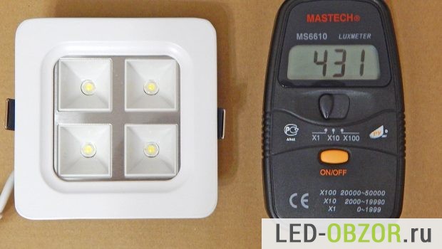 А вот точечный светодиодный светильник J18 сразу показался подозрительным. После измерений в кубе, получилось 431Люкс. Вычислим яркость: