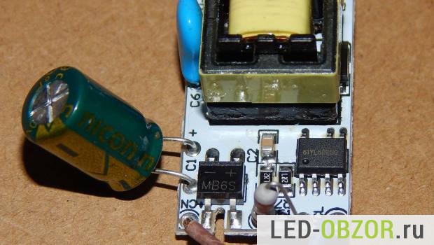 Драйверы этих моделей отличаются незначительно, у квадратного LK0778CA, у круглого LK0305. В одном из них отсутствует маркировка микросхемы стабилизатора. На втором используется 61YL5DEUG. Обе микросхемы китайского происхождения и найти на них спецификаций не получилось, соответственно неизвестна схема типового включения. На выходе установлены конденсаторы на 4,7 мкФ, это как то маловато. На десятиватных драйверах ставят по 50 мкФ. Но камера смартфона не показала мерцания, этот показатель в норме. В идеале это надо проверять на осциллографе.