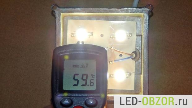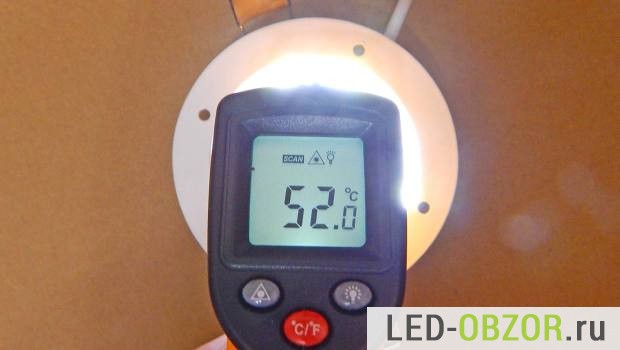 Охлаждение сделано неплохо, габариты встраиваемых led светильников достаточно большие для мощности в 4-5Вт. При наличии недостатков в сборке, перегрева нет. В следующих обзорах буду проводить тестирование на деградацию в условиях высокой температуры окружающей среды. Встраиваемый диодный светильник заворачивается в полотенце или изолон. Для контроля температуры ставится термопара на необходимые элементы.
