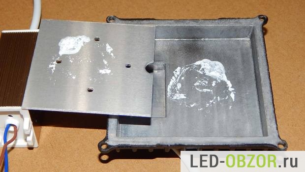 Алюминиевая пластинка с диодами к радиатору вообще никак не крепится. Хотя снаружи видно, что отверстия предусмотрены, но не сделаны. Термопасты очень сильно пожалели, капнули в одно место для вида, а размазывать не стали. В общем светодиоды могут просто болтаться в корпусе, плотного контакта с радиатором нет.