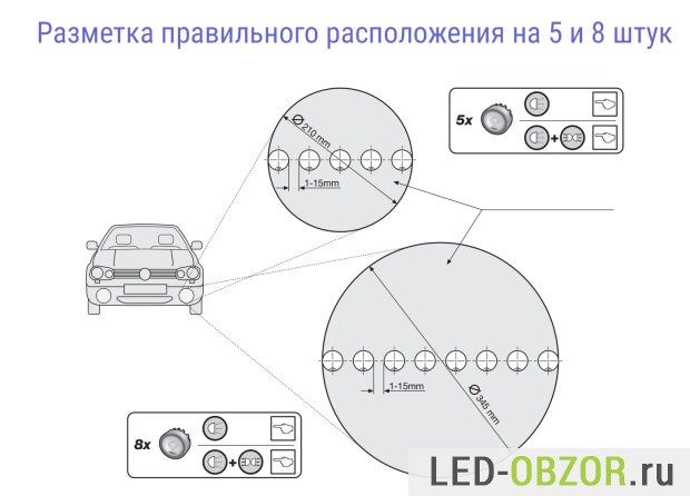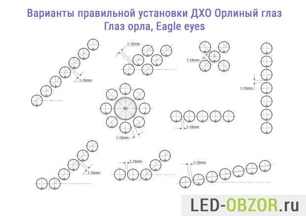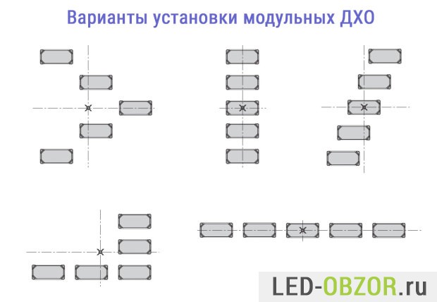 Практически все знают, как установить дневные ходовые огни в состоящие из комплекта модулей. Такую конструкцию можно поставить куда угодно, типовые схемы размещения изображены на картинке ниже. Требуется только просверлить отверстия под болты. Еще крепление бывает на двухстороннем скотче, но под воздействие соли и атмосферных условий могут просто отваливаться.