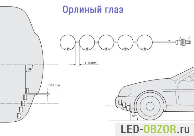Самая сложная установка ДХО своими руками у орлиного глаза, который обычно выполнен в виде болта с гайкой. Для монтажа требуется ровная поверхность и сверление отверстий. Чаще всего ставят в бампер, расположив в одну линию. Кому то нравится сверлить заглушки от противотуманок, чтобы не портить баннер.