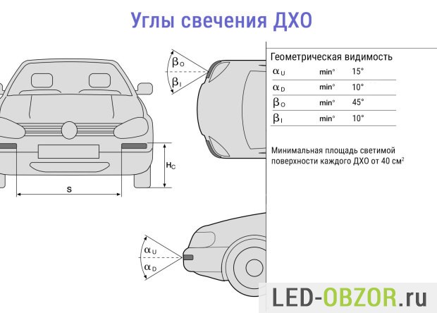 - площадь освещающей поверхности каждого DRL минимум 40 см², чтобы не ставили мощные маленькие светодиоды.
